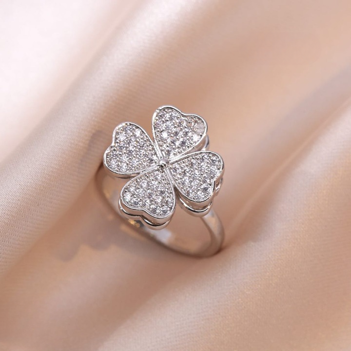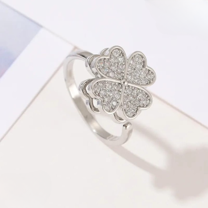 Clover Zircon Rotating Ring – Silver & Golden, Adjustable Spinner Ring for Women (QSJ-111)
