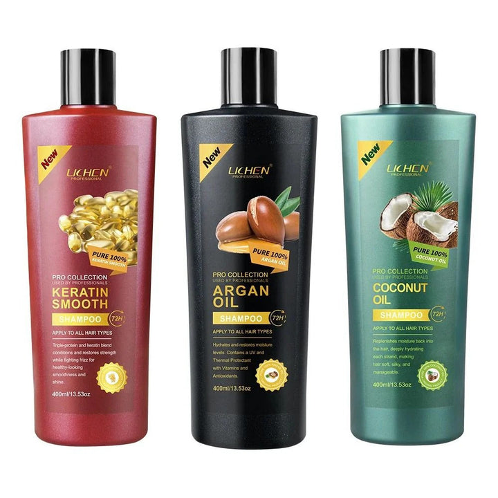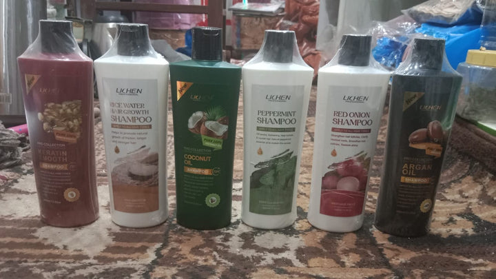 The Lichen Professional Shampoo set (400ml each) is designed for complete hair care for all hair types. Keratin Smooth controls frizz and adds softness, Rice Water supports hair growth and strength, Coconut Oil deeply nourishes and adds shine, Peppermint refreshes and cleans the scalp, Red Onion helps reduce hair fall and supports growth, while Argan Oil provides moisture and smoothness. Made in China with a quality formula for daily use, these shampoos help keep your hair healthy, strong, and shiny.- Net weight : 400ml